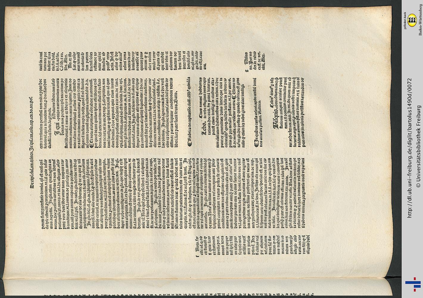 Universitätsbibliothek Freiburg i. Br., Ink. 2.Q 508 Bartolus de Saxoferrato; Johannes, Siber [DruckerIn]; Angelus de Ubaldis [Mitarb.]; Alexander de Imola [Mitarb.]