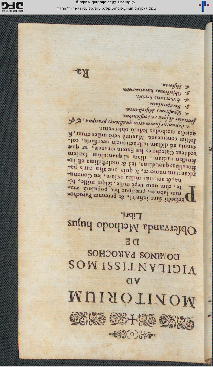 Monitorium Ad Vigilantissimos Dominos Parochos De Observanda Methodo hujus Libri.